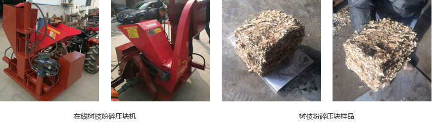 树枝粉碎后如无需压块则采用单一功能的树枝“粉碎机”,其粉碎的技条可装袋或抛撒还田,成本低功效高。